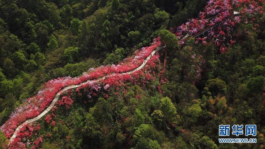 安徽省岳西县天峡风景区内的杜鹃花竞相绽放(4月12日无人机拍摄)。 新华社记者 张端 摄