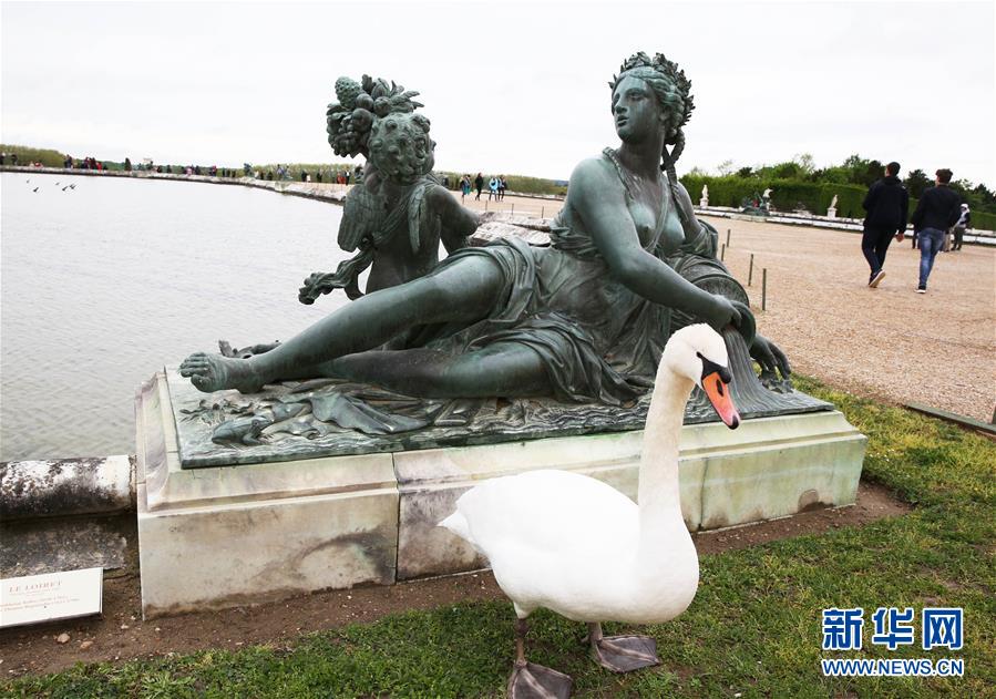 4月25日,在法国巴黎近郊的凡尔赛花园,一只白鹅站在青铜雕塑前。