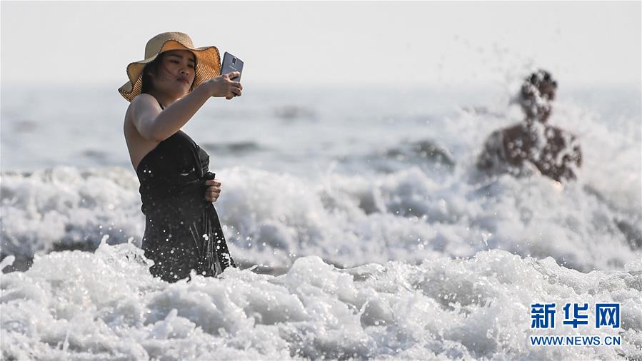 游客在北海市银滩冲浪戏水(4月18日摄)。新华社记者张爱林摄