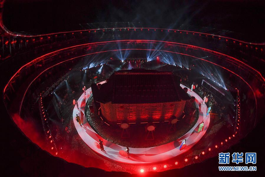 4月27日,模特在位于福建省南靖县的土楼裕昌楼展示服饰。 当日,土楼光语国际时尚大秀在福建省南靖县的土楼裕昌楼内举行。这场融汇文化、时尚与旅游元素的大秀,通过传统与时尚的有机融合,展现南靖土楼及文化的魅力和风采。 新华社记者 宋为伟 摄