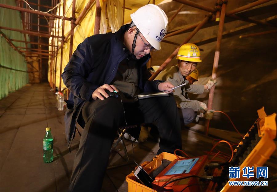 中铁西北科学研究院有限公司文保中心的工程师孙博(左)在检测探头的数据稳定性(3月18日摄)。新华社记者 江宏景 摄