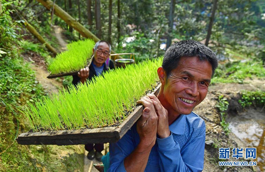 在黔桂乌英苗寨,村民搬运秧苗去插秧(4月17日摄)。 新华社记者 黄孝邦 摄