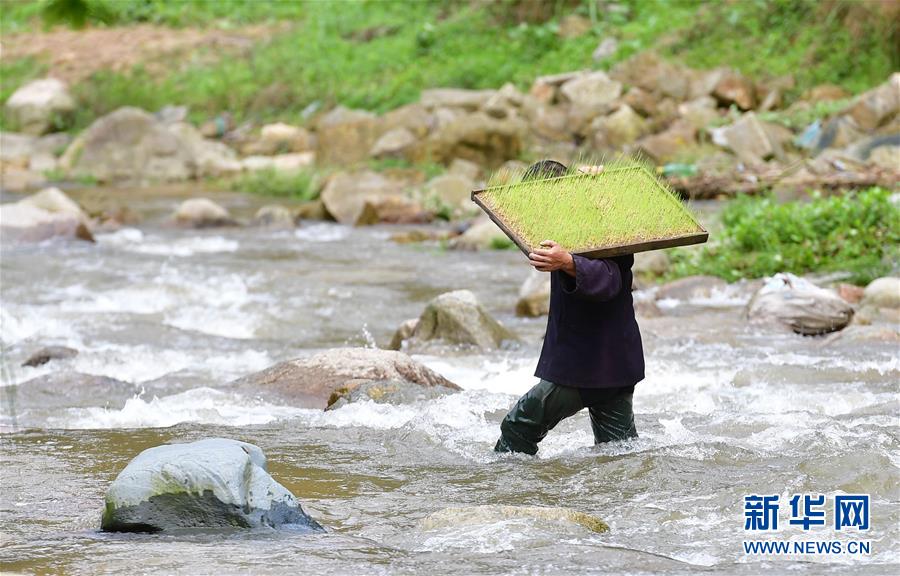 在黔桂乌英苗寨,村民扛着秧苗过河,准备插秧(4月16日摄)。 新华社记者 黄孝邦 摄