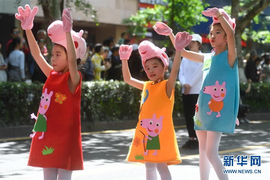 5月4日,扮演成“小猪佩奇”的演员在巡游队伍中表演。当日,第十五届中国国际动漫节彩车巡游活动在浙江杭州南宋御街中北创意街区举行。巡游表演队伍约500米长,由4辆大型动漫彩车、1辆小火车及400多名演员组成。新华社记者 黄宗治 摄