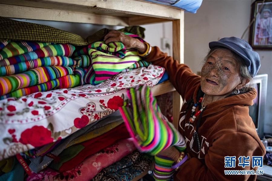 75岁的“文面女”李文仕在整理她编织的独龙毯(4月21日摄)。 70年,在人类历史长河中不过弹指一瞬。但对独龙族同胞来说,新中国的70年,他们仿佛进入了时空穿梭隧道,沧桑巨变,千古未有。 他们告别苦难,迎来阳光。他们告别封闭,走向开放。他们告别原始落后,拥抱现代文明。最近,他们宣告整族脱贫,实现“千年一跃”。 新华社记者 江文耀 摄