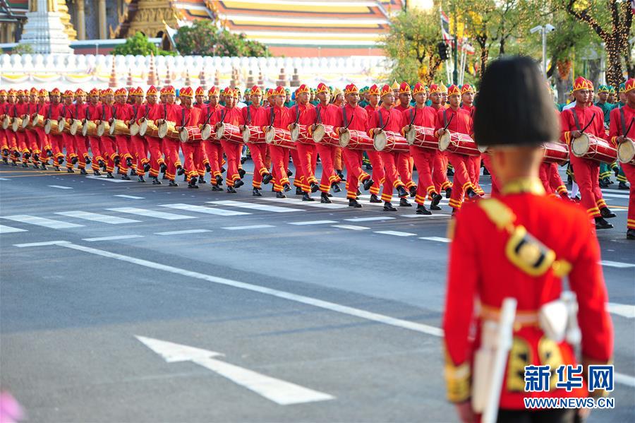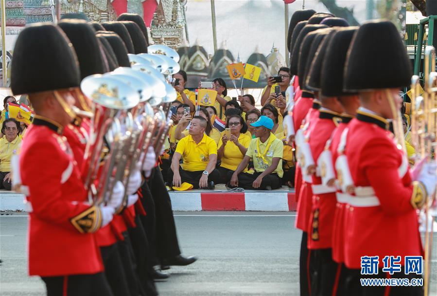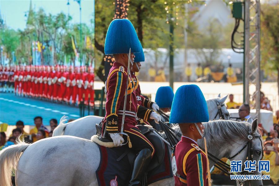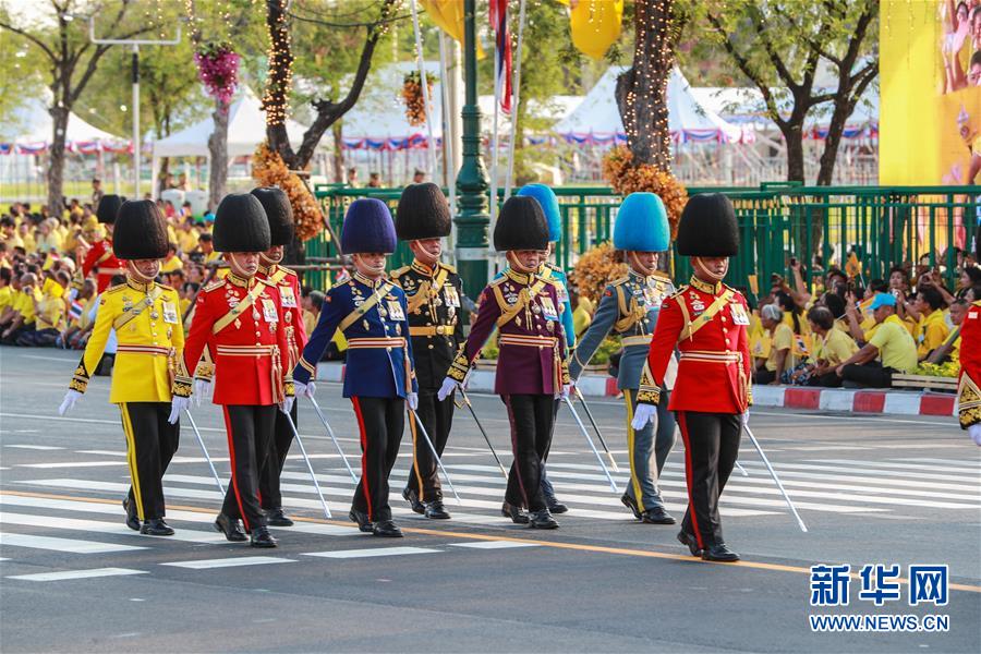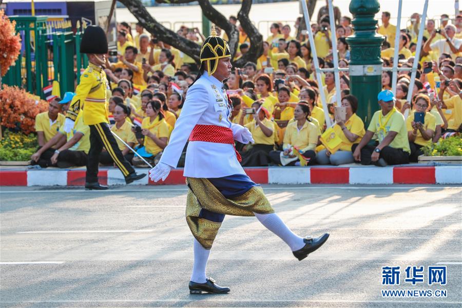 5月5日,仪仗队在曼谷大王宫附近举行的泰国国王加冕典礼巡游上列队前进。 新华社发(拉亨摄)