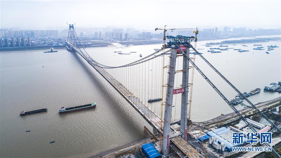 当日,随着最后一节钢梁吊装到位,由中铁大桥院设计、中铁大桥局施工的武汉杨泗港长江大桥顺利合龙,标志着这座世界最大跨度双层公路悬索桥主体工程完工,进入桥面铺装阶段。 武汉杨泗港长江大桥是武汉市内建设的第十座长江大桥,也是长江上首座双层公路大桥。 新华社记者 肖艺九 摄