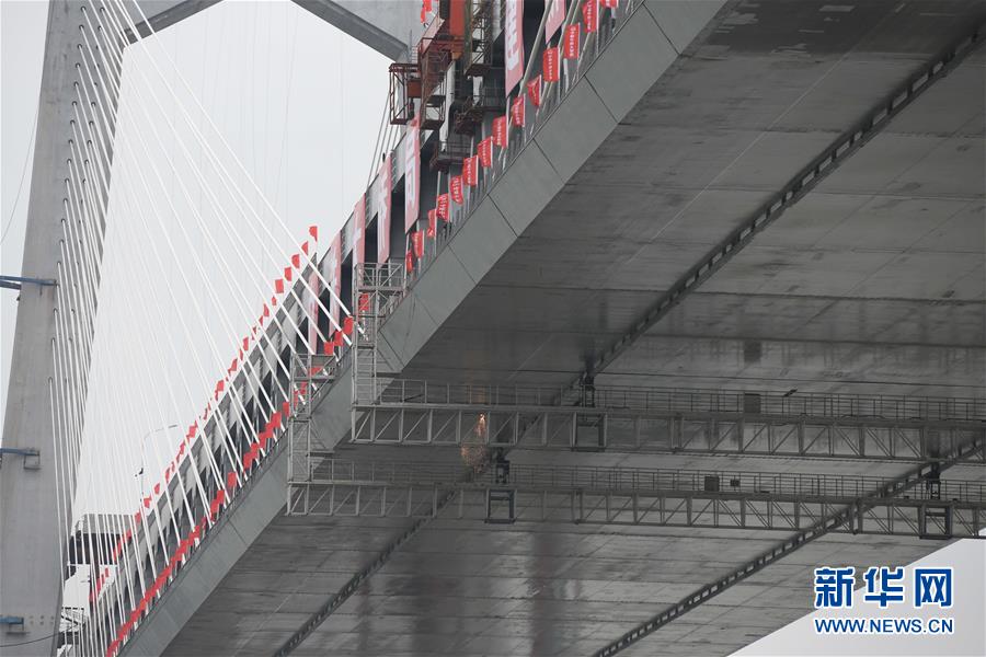 商合杭铁路芜湖长江公铁大桥合龙现场(4月26日摄)。
