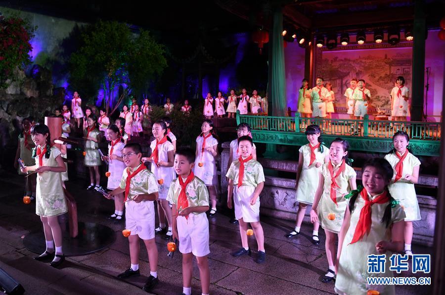 5月5日,小学生在福州三坊七巷的水榭戏台表演。 福州三坊七巷为国内现存规模较大、保护较为完整的历史文化名街区,是中国十大历史文化名街之一。位于三坊七巷内的水榭戏台经常举办传统文化演出吸引游客慕名前来观赏。 新华社记者 林善传 摄