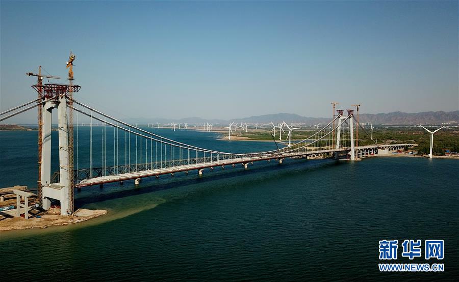 建设中的官厅水库公路大桥(5月6日无人机拍摄)。 河北省怀来县官厅水库公路大桥是怀来沙城至东花园公路的节点工程,预计该桥将于2019年6月竣工。 新华社记者 杨世尧 摄