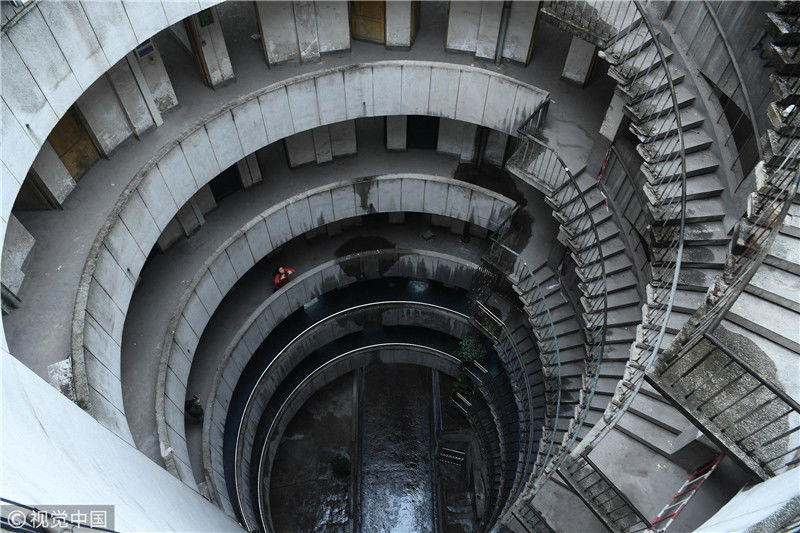2018年12月11日,重庆红旗河沟汽车站办公大楼。八层的圆筒型转转楼,站在楼里往上望,可以看见碗口大的天空。图片作者:寻常