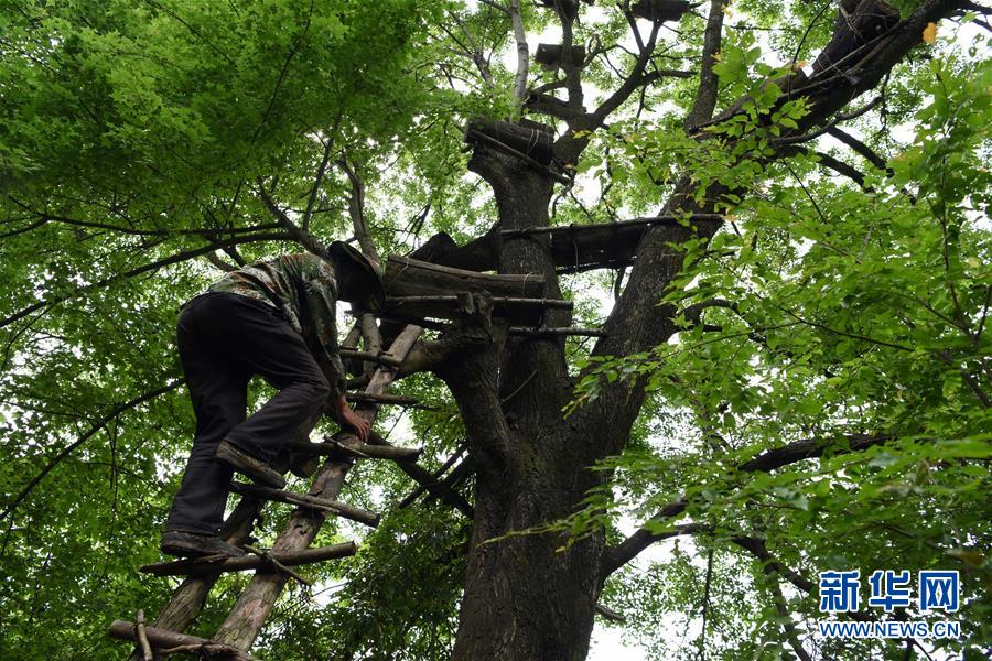 5月10日,在甘肃省陇南市徽县大河店镇硬湾村,蜂农刘辉林准备查看放在树上的蜂箱情况。 甘肃省陇南市徽县大河店镇硬湾村位于秦巴山区深处,2017年,在当地政府的扶持下,龙崖老巢蜜养殖农民专业合作社成立,蜂农们将传统养蜂技艺和现代加工方式相结合,并通过电商等渠道打开销路,有效带动了当地贫困村民脱贫致富。目前整个合作社共有蜂箱2000余个,每箱每年可带来三四千元的收入。 新华社记者 马宁 摄