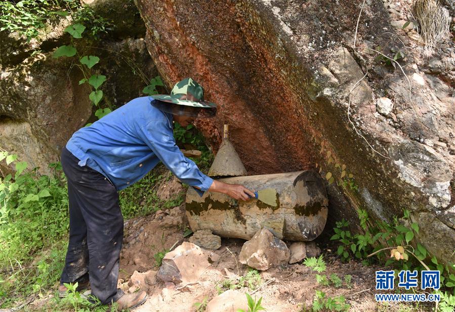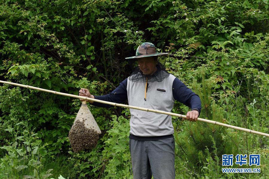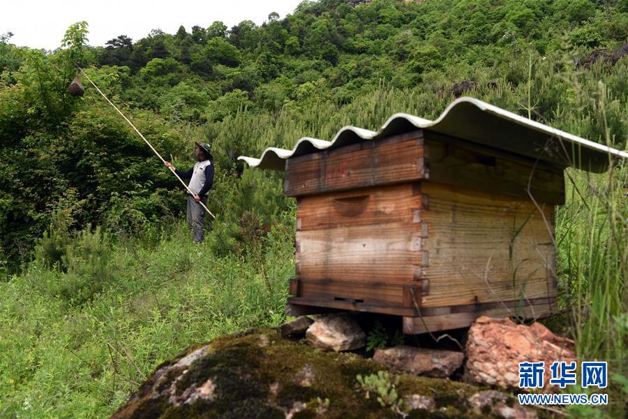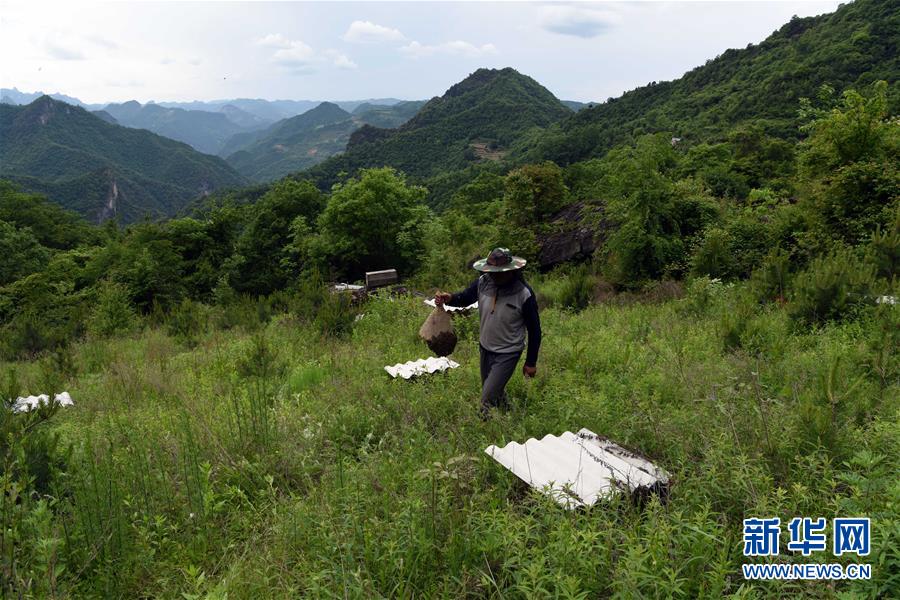 5月10日,在甘肃省陇南市徽县大河店镇硬湾村,蜂农周仲颐在收蜂。 甘肃省陇南市徽县大河店镇硬湾村位于秦巴山区深处,2017年,在当地政府的扶持下,龙崖老巢蜜养殖农民专业合作社成立,蜂农们将传统养蜂技艺和现代加工方式相结合,并通过电商等渠道打开销路,有效带动了当地贫困村民脱贫致富。目前整个合作社共有蜂箱2000余个,每箱每年可带来三四千元的收入。 新华社记者 马宁 摄
