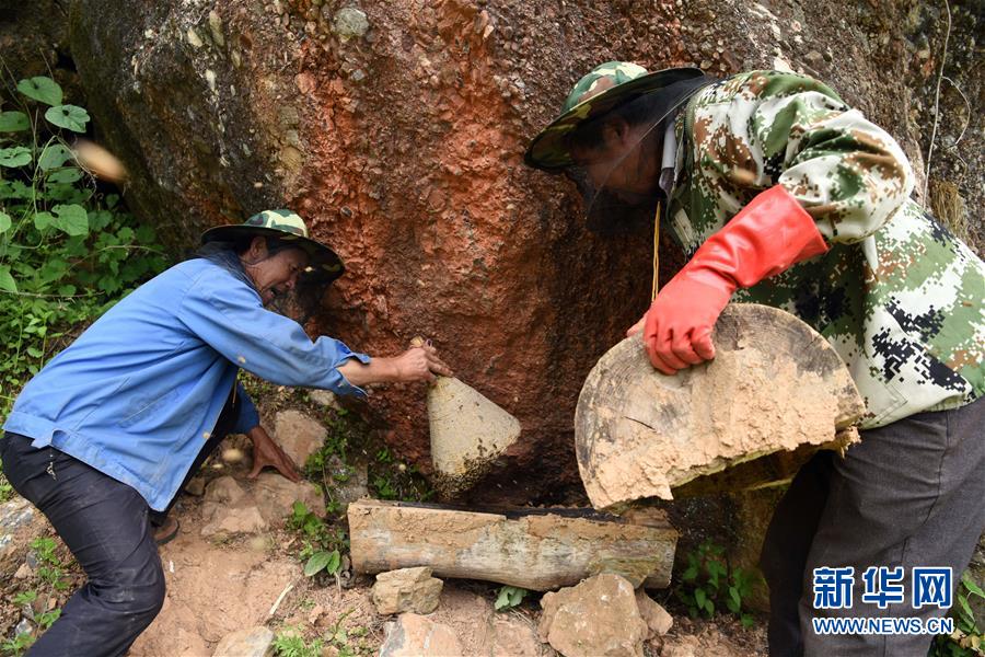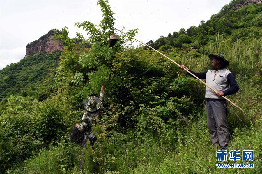 5月10日,在甘肃省陇南市徽县大河店镇硬湾村,蜂农周仲颐(右)在收蜂。 甘肃省陇南市徽县大河店镇硬湾村位于秦巴山区深处,2017年,在当地政府的扶持下,龙崖老巢蜜养殖农民专业合作社成立,蜂农们将传统养蜂技艺和现代加工方式相结合,并通过电商等渠道打开销路,有效带动了当地贫困村民脱贫致富。目前整个合作社共有蜂箱2000余个,每箱每年可带来三四千元的收入。 新华社记者 马宁 摄