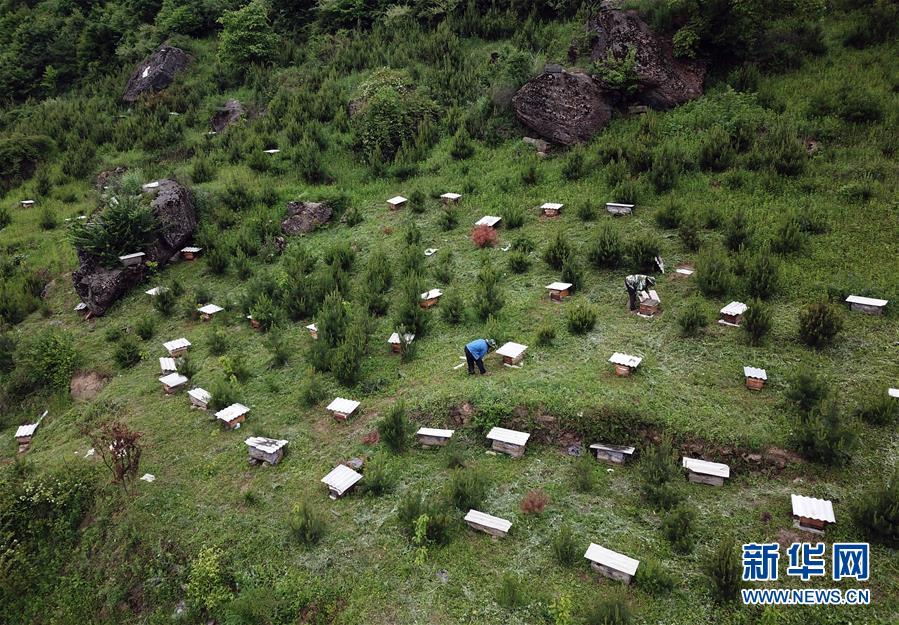5月10日,在甘肃省陇南市徽县大河店镇硬湾村,蜂农查看蜂箱情况(无人机拍摄)。 甘肃省陇南市徽县大河店镇硬湾村位于秦巴山区深处,2017年,在当地政府的扶持下,龙崖老巢蜜养殖农民专业合作社成立,蜂农们将传统养蜂技艺和现代加工方式相结合,并通过电商等渠道打开销路,有效带动了当地贫困村民脱贫致富。目前整个合作社共有蜂箱2000余个,每箱每年可带来三四千元的收入。 新华社记者 马宁 摄