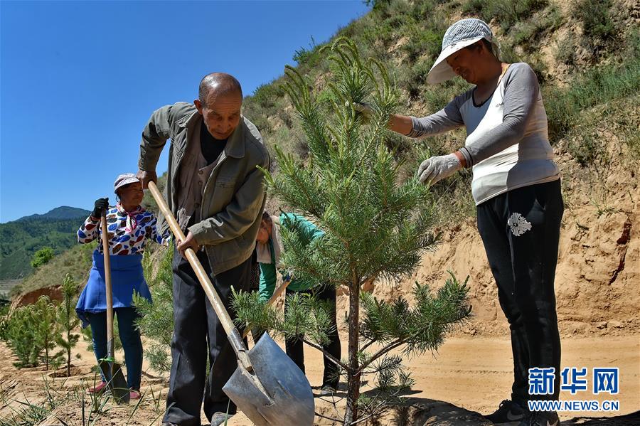 2017年5月26日,岚县会里村村民在吕梁山上种树。新华社记者 曹阳 摄