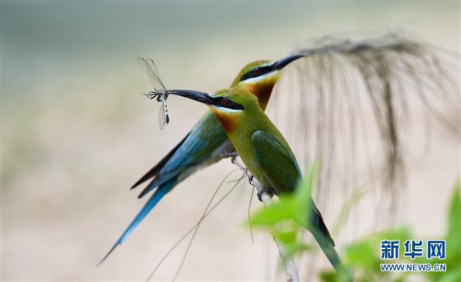 5月14日,栗喉蜂虎在枝头进食。 新华社记者 杨冠宇 摄