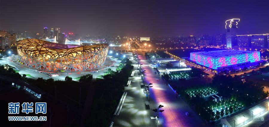 5月14日,“鸟巢”和“水立方”灯光璀璨。 当晚,一场“空间光影秀”在北京上演。 新华社记者 李贺 摄