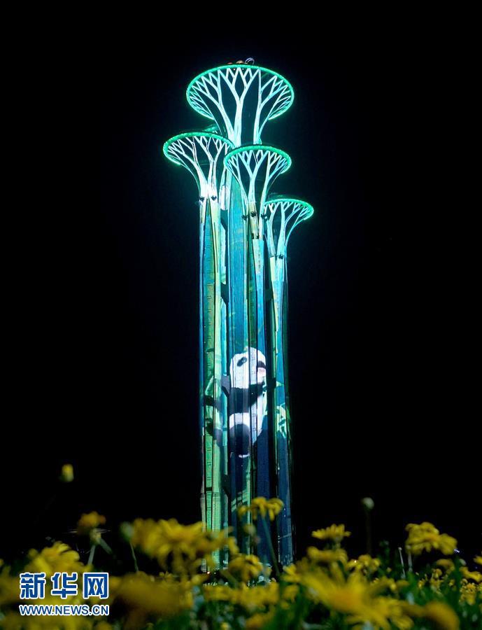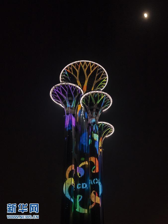 奥林匹克塔灯光璀璨(5月14日摄)。 当晚,一场“空间光影秀”在北京上演。 新华社记者 李贺 摄