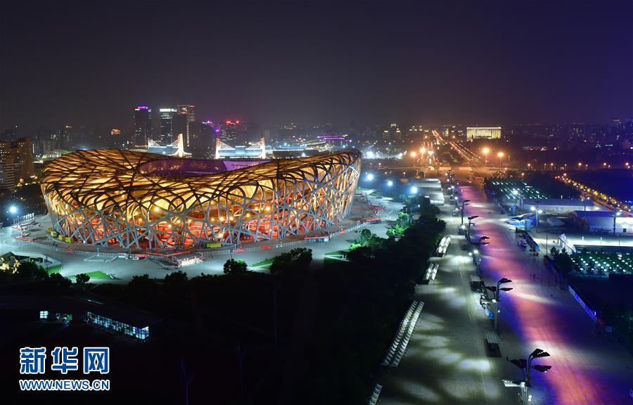 “鸟巢”灯光璀璨(5月14日摄)。 当晚,一场“空间光影秀”在北京上演。 新华社记者 李贺 摄