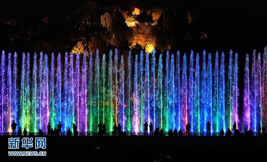 5月14日,游客在奥林匹克森林公园观看水幕灯光秀。 当晚,一场“空间光影秀”在北京上演。 新华社记者 鞠焕宗 摄