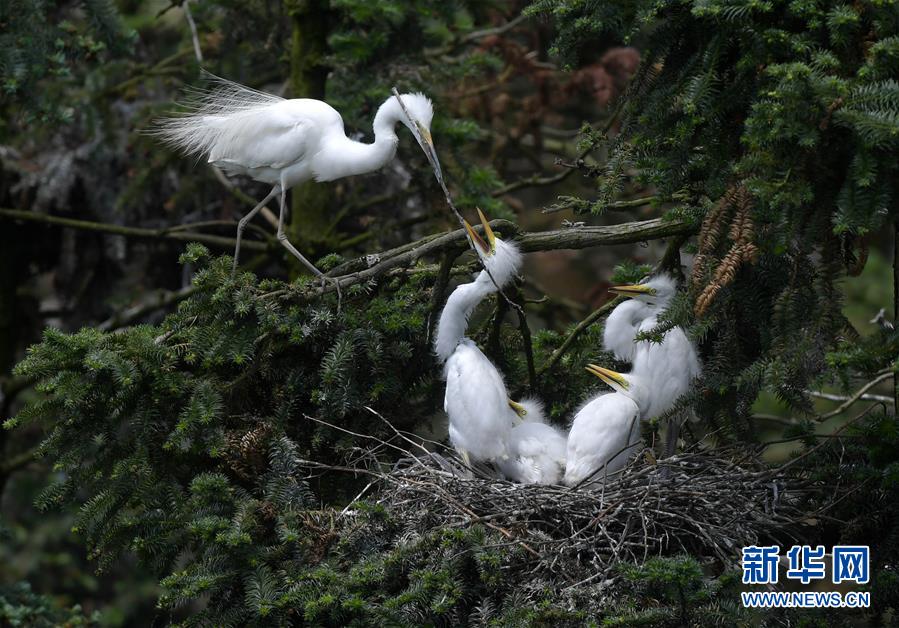 在江西省南昌市新建区象山森林公园内,白鹭和自己的雏鸟在一起(5月21日摄)。 近日,在江西省南昌市新建区象山森林公园内,已安家筑巢的大批鹭鸟陆续孵化出了后代。象山森林公园有着“鹭鸟王国”的美誉,生态环境良好,每年都会吸引白鹭、苍鹭、夜鹭等种类的鹭鸟飞抵栖息和繁衍后代。 新华社记者 彭昭之 摄