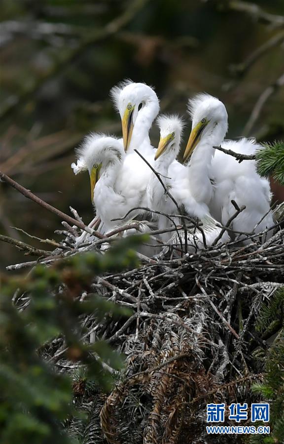 江西省南昌市新建区象山森林公园内的白鹭雏鸟(5月21日摄)。 近日,在江西省南昌市新建区象山森林公园内,已安家筑巢的大批鹭鸟陆续孵化出了后代。象山森林公园有着“鹭鸟王国”的美誉,生态环境良好,每年都会吸引白鹭、苍鹭、夜鹭等种类的鹭鸟飞抵栖息和繁衍后代。 新华社记者 彭昭之 摄
