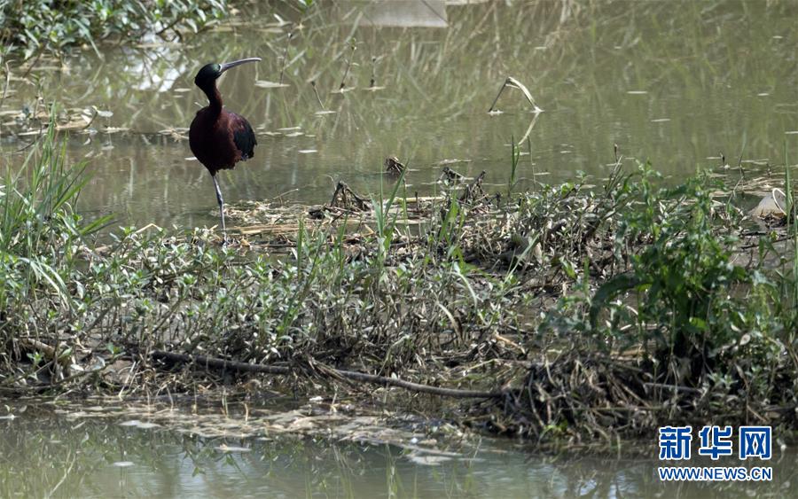 5月21日,一只彩鹮在汉江湿地公园里栖息。 近日,国家二级保护动物彩鹮现身陕西省汉中市汉江湿地公园濂水河与汉江交汇处。 据陕西师范大学生命科学院教授于晓平介绍,彩鹮在世界上的分布比朱鹮还要少,这几年在云南发现得多一些,这3只彩鹮现身汉江濂水河畔,是陕西首次发现彩鹮踪迹。 据了解,彩鹮是国家二级保护动物,属鹈形目鹮科,体羽大部为青铜栗色,是珍稀鸟类朱鹮的“近亲”,体型比朱鹮略小。 新华社记者陶明摄