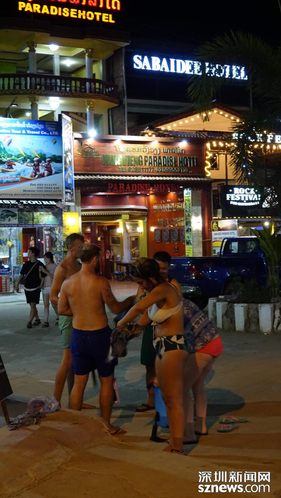 万荣的开放程度很高。夜晚,南松河畔、街道两旁都是酒吧,常常可以看到漂流回来身着泳装的“老外”当街站立。李仁奇 摄