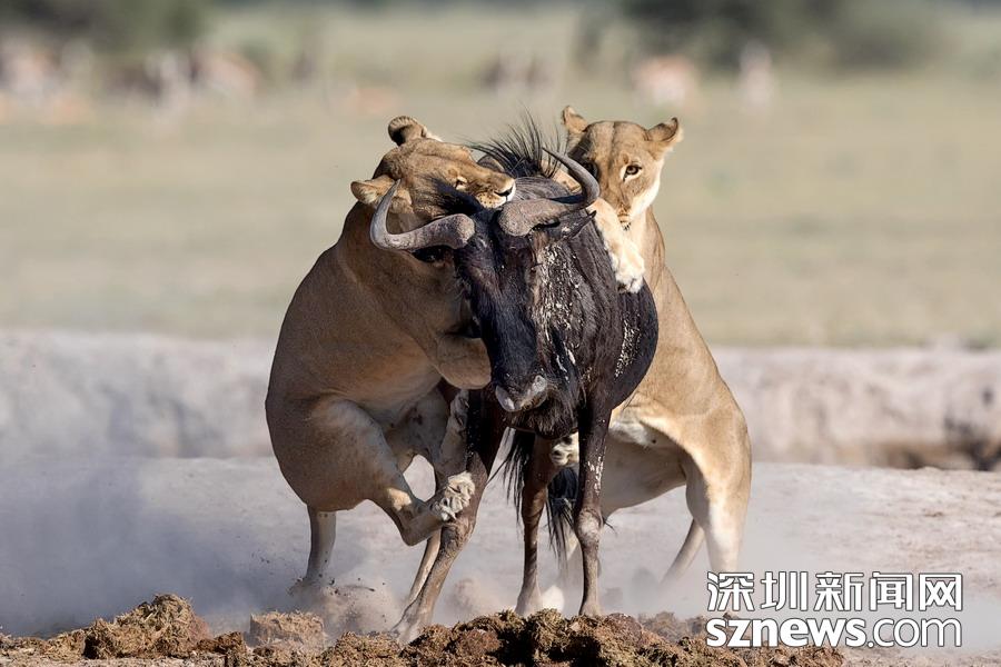 英国摄影师苏-莫里斯(Sue Morri)在博茨瓦纳Nxai Pan国家公园游玩,目睹了一场凶恶母狮猎食角马的画面。母狮甚至攀到了角马背上,想要牢牢遏制住到手的“美餐”。强壮的角马努力地与母狮抗争,竭力想要保住自己的性命,但最终还是不敌母狮被拿下,最后成了母狮孩子们的盘中餐。