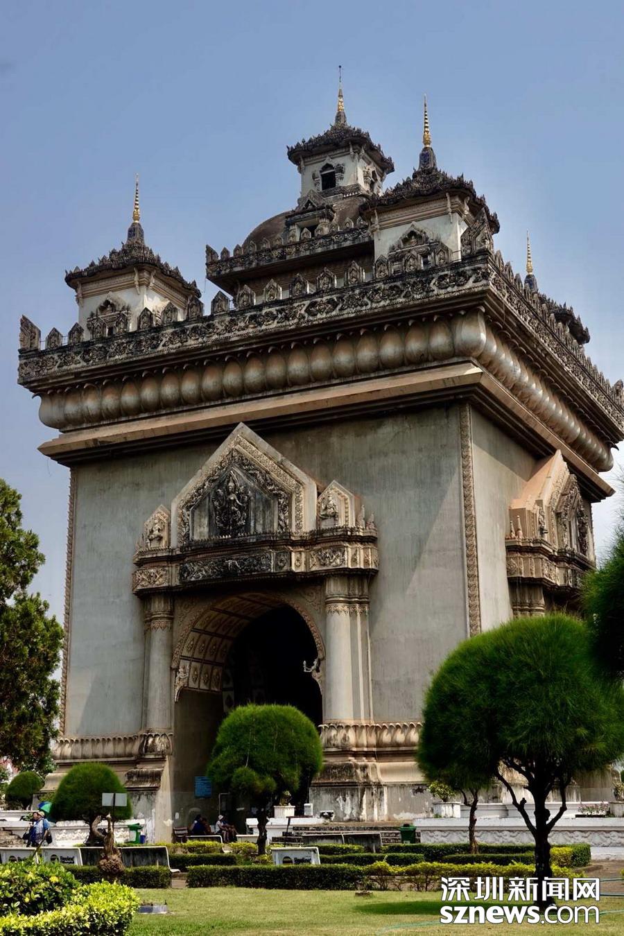 凯旋门位于市中心,为纪念老挝人民顽强抵抗外敌入侵而建,门高45米,宽24米,远观和法国巴黎的凯旋门相似,但上部是典型的老挝风格,拱门基座上的雕刻很精美。站在它的顶部能够一览周边的政府建筑和整个城市的风貌。李仁奇 摄