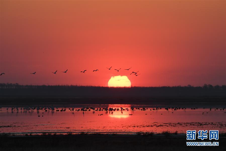 在吉林莫莫格国家级自然保护区,一群白鹤从湿地上空飞过(4月11日摄)。 新华社记者 张楠 摄