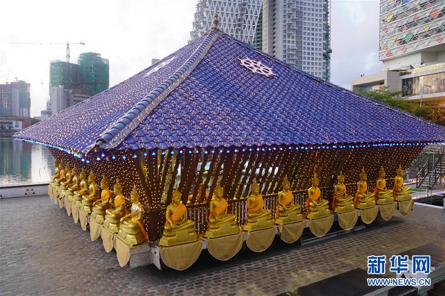 这是斯里兰卡科伦坡的水中庙(5月27日摄)。 在科伦坡贝拉湖上有一座木造楼阁——水中庙。木造建筑上面覆盖着蓝瓦,外围环绕着线条优美的佛像。楼阁外高台上供奉的佛像,与不远处的高层建筑相互映照。祥和宁静的水中庙已成为人们修心、祈福的重要场所。 新华社记者唐璐摄
