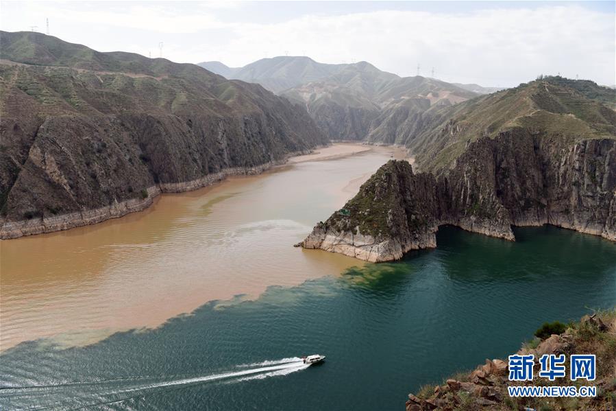 6月2日,在甘肃省临夏回族自治州永靖县刘家峡水库,一艘快艇在洮河和黄河的汇合水域行驶。