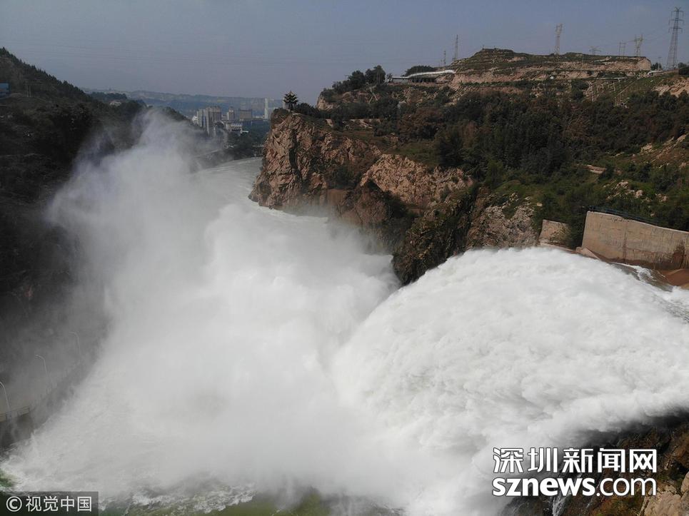 2018年9月11日,甘肃临夏,刘家峡水库泄洪力降水位。今年主汛期以来,受黄河上游持续大范围降雨影响,刘家峡水库入库流量大幅增长,为确保黄河中下游安全度汛,刘家峡水电厂按照黄河防总调度要求,不断调控下泄流量,全力做好防汛度汛工作。