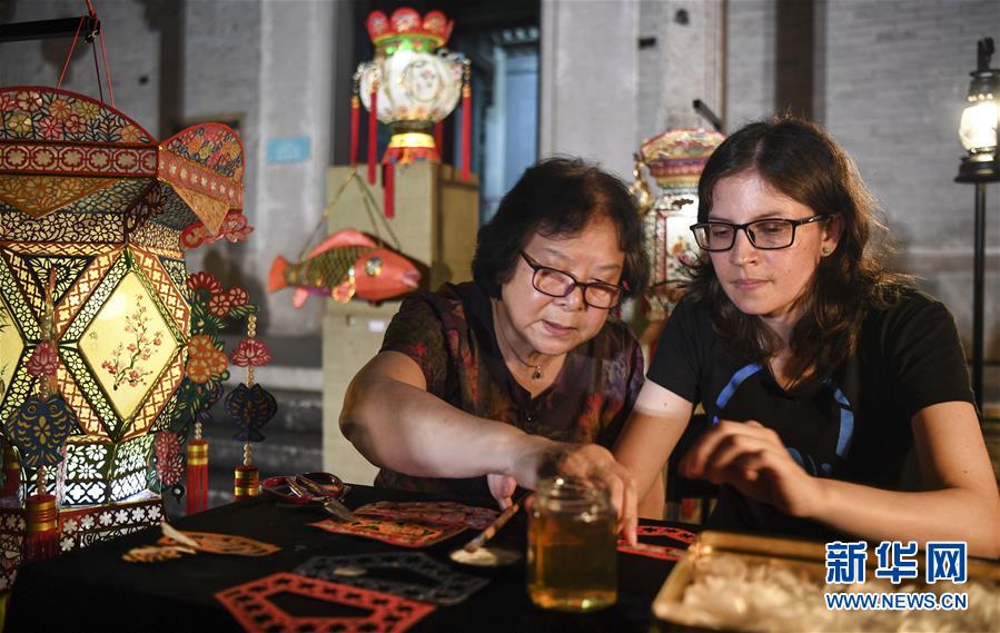 国家级非遗传承人杨玉榕(左)在古驿道陈芳家宅外广场指导外国留学生制作彩灯(5月31日摄)。
