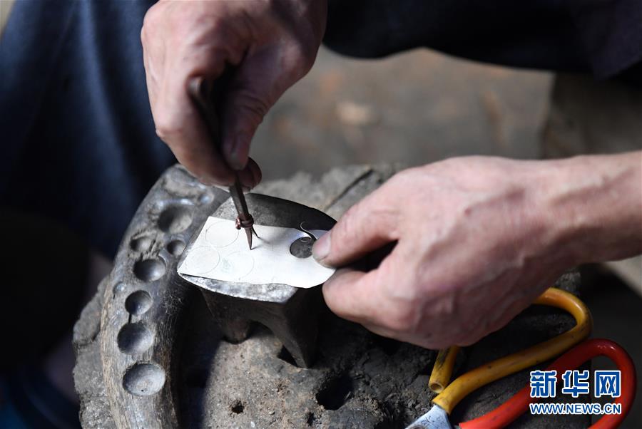 5月29日,在广西融水苗族自治县融水镇,银匠陈四先在打造苗族银饰。