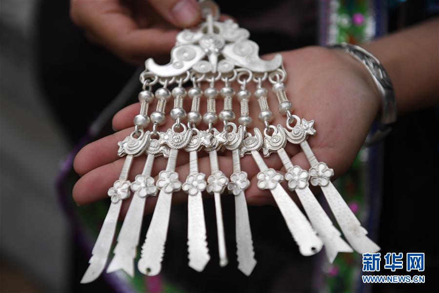 5月29日,在广西融水苗族自治县融水镇,一名女青年在展示一款苗族银饰。