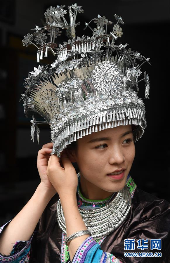 5月29日,在广西融水苗族自治县融水镇,一名女青年在戴苗族银饰。