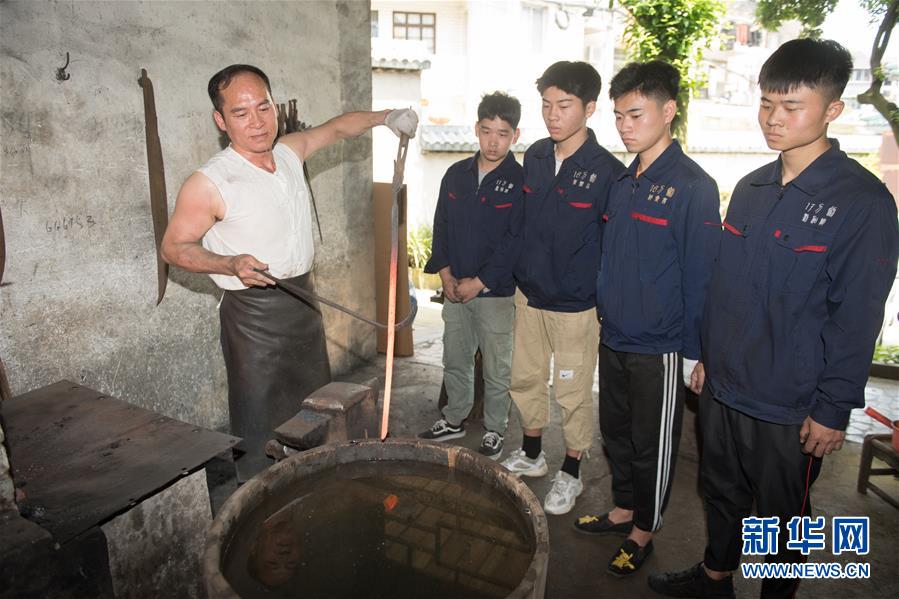 5月21日,郑国荣在“古越剑铺”向徒弟们传授宝剑淬火技艺。 新华社记者 翁忻旸 摄
