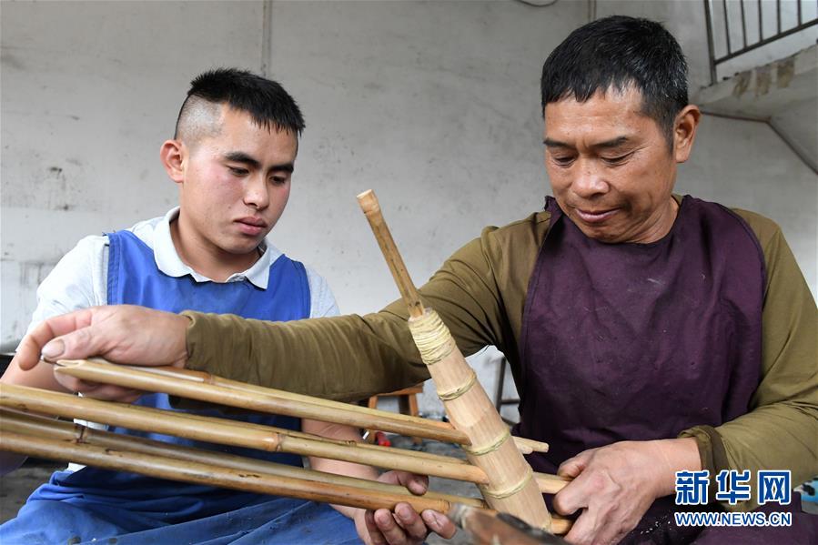 5月30日,在融水苗族自治县安太乡小桑村青山屯,杜信文(左)和父亲杜庆仁一起制作芦笙。 新华社记者 陆波岸 摄