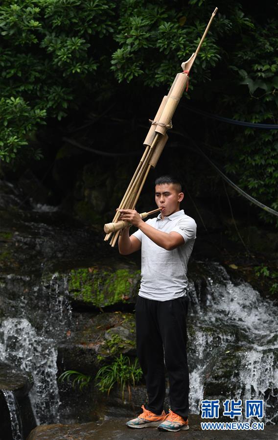 5月30日,在融水苗族自治县安太乡小桑村青山屯,杜信文在家门外试吹一把刚刚制作完成的芦笙。 新华社记者 陆波岸 摄
