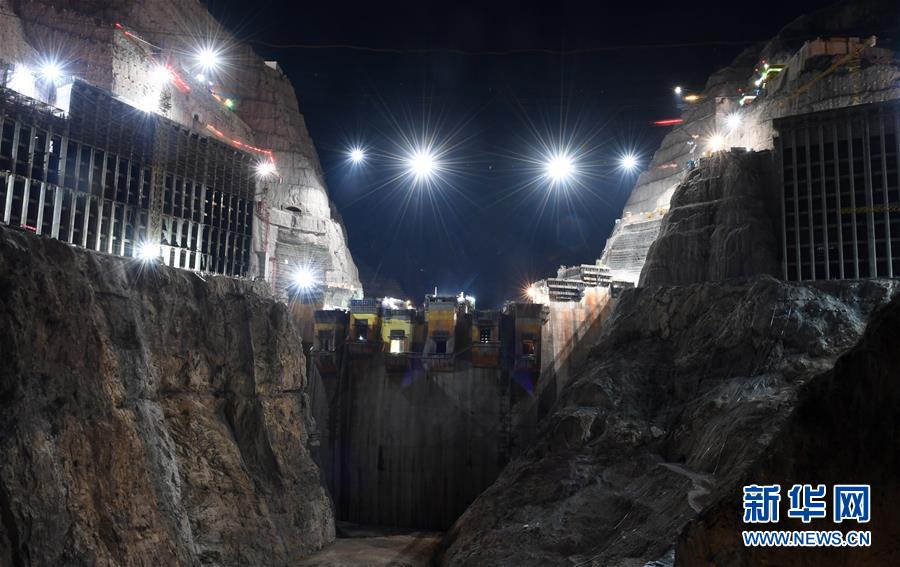 这是正在紧张施工的乌东德水电站大坝主体工程夜景(5月31日摄)。 新华社记者陈晔华摄