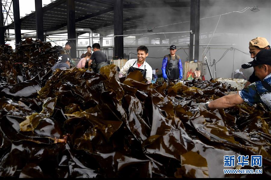 6月5日,在荣成市寻山街道青鱼滩村,渔民在收获海带。 近日,山东省荣成市迎来海带收获季。据悉,荣成市海带养殖面积14.5万亩,年产海带43.3万吨以上。 新华社记者郭绪雷摄