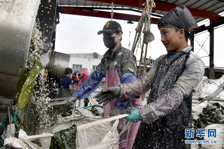 6月5日,在荣成市寻山街道青鱼滩村,渔民在加工刚收获的海带。 近日,山东省荣成市迎来海带收获季。据悉,荣成市海带养殖面积14.5万亩,年产海带43.3万吨以上。 新华社记者郭绪雷摄