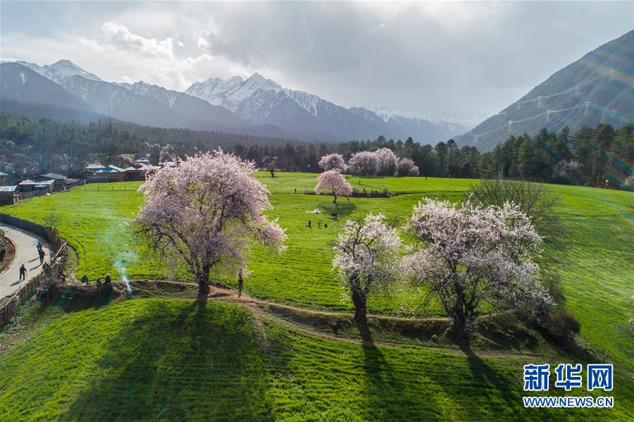 西藏林芝波密县境内桃花盛开的田园风光(4月5日无人机拍摄)。