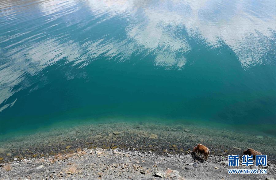 两头牛在西藏羊湖边喝水(5月24日摄)。
