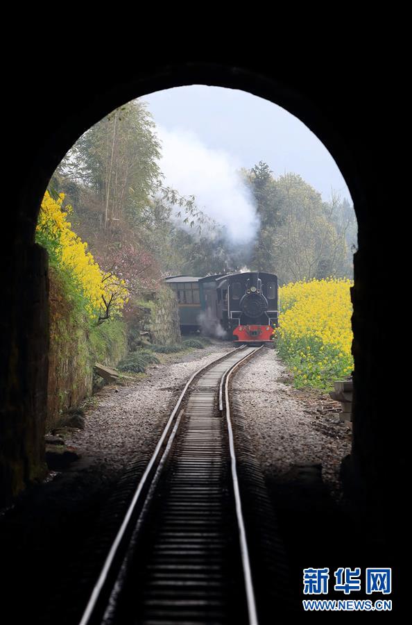 初春时节,在花海中穿行的嘉阳小火车迎来了每年的旅游旺季,众多游客慕名前来乘坐。