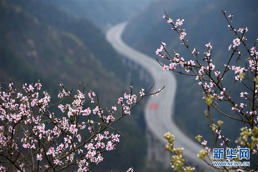 贵州思剑高速公路剑河县岑松镇段的春季景观(3月23日摄)。阳春时节,贵州思(南)剑(河)高速公路剑河县岑松镇附近的桃花和梨花陆续开放。 新华社记者杨文斌摄