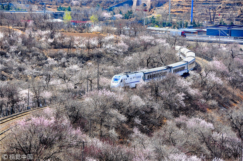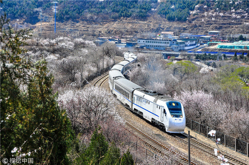 2019年3月22日,北京居庸关附近的山花盛开,S2线列车穿行在花海之中,构成一幅美丽的画面。时永平/千龙图像/视觉中国 编辑/陈进